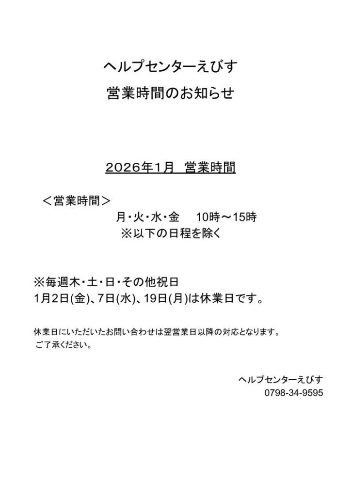 以下の通り、ヘルプセンターえびすの2026年1月の営業日・時間をお知らせいたします。