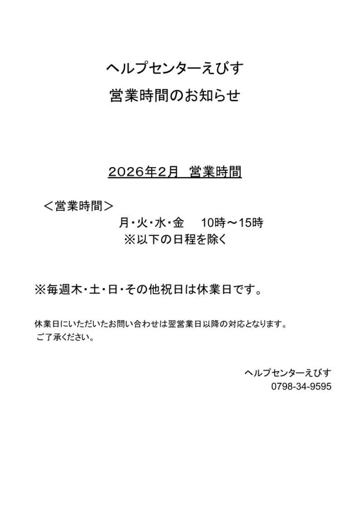 以下の通り、ヘルプセンターえびすの2026年2月の営業日・時間をお知らせいたします。