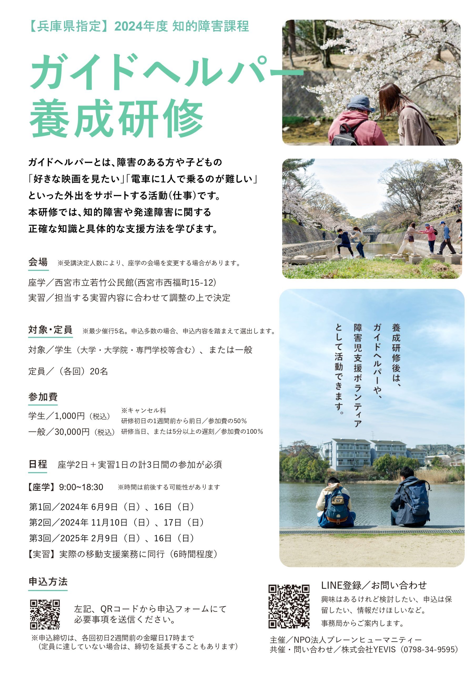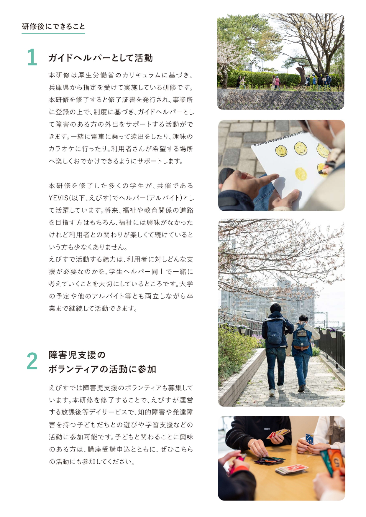 えびすでは1年間で約3回のガイドヘルパー養成研修(知的障害課程)を、NPO法人ブレーンヒューマニティーと開催しています。西宮市・神戸市を中心に大学生や専門学生の参加が多く、養成研修後はえびすでガイドヘルパーとして活動が可能です。